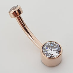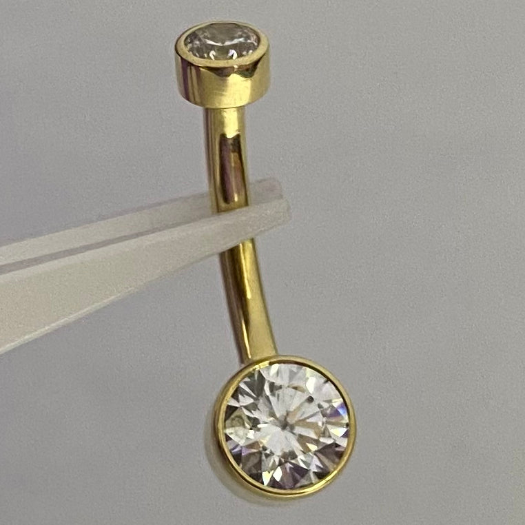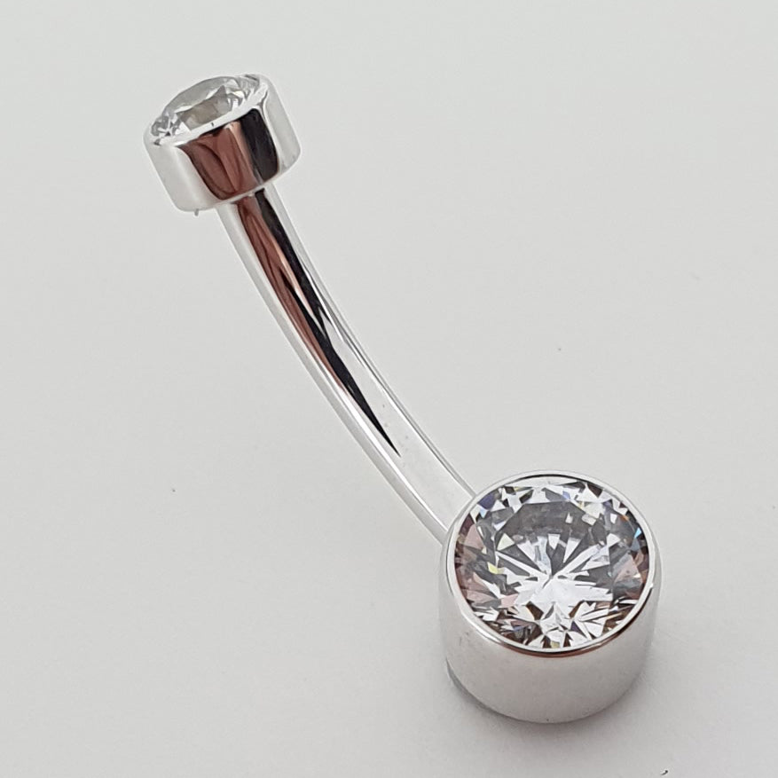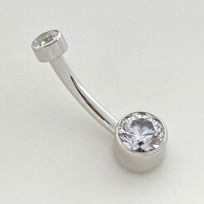 A true classic piece featuring a pair of bezel set brilliant cut gemstones on a navel curve, a timeless style that would perfectly suit a navel or a VCH piercing.