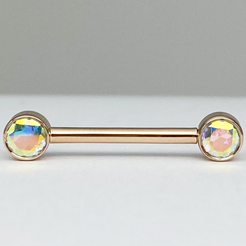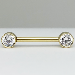 Two timeless brilliant cut gemstones housed in a simple bezel setting at either end of a classic barbell, this was made to be worn in a nipple piercing, but can also work for your bridge or frenum.