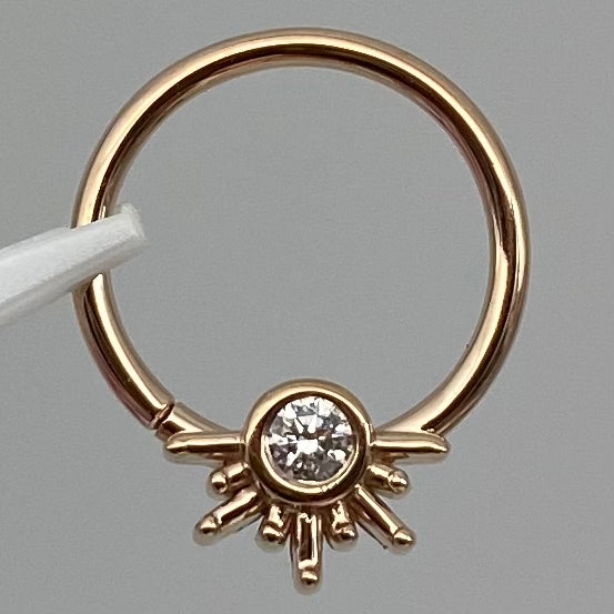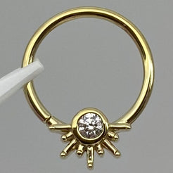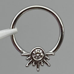 This ring has a stunning bezel set gem stone accented with with rays set onto the top, it would look perfect in your daith or septum piercing.