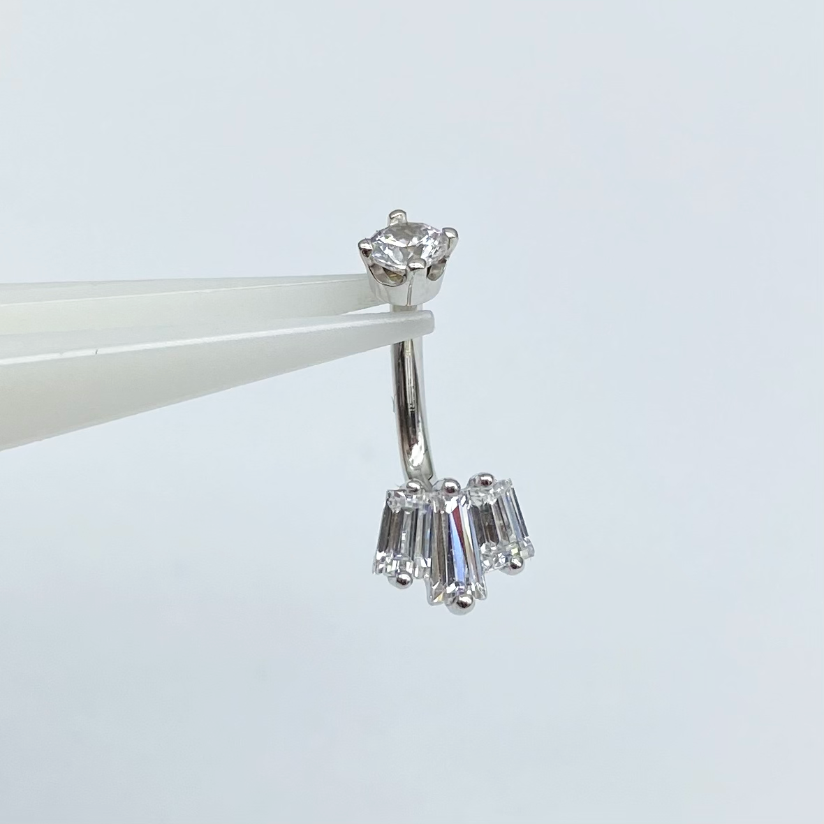 A stunning cluster of three different sized tapered baguette cut gemstones arranged in a subtle arc shape, nested at the bottom of this regal j-curve style barbell. With a 3mm gemstone on top this is the perfect piece to crown your rook piercing.